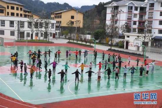 重慶市石柱土家族自治縣中益鄉(xiāng)小學(xué)的同學(xué)們?cè)诶蠋煹膸ьI(lǐng)下練習(xí)擺手舞(2020年1月10日攝)。 新華社記者 王全超 攝