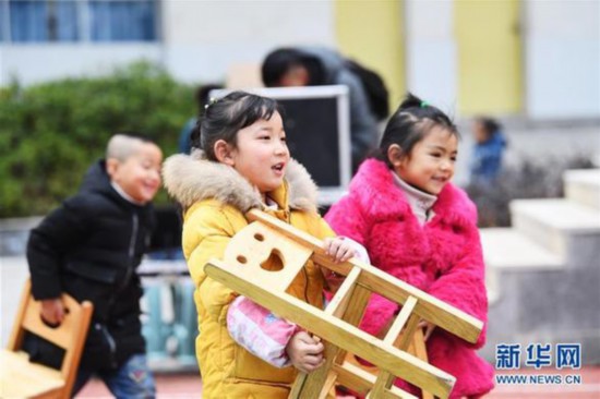重慶市石柱土家族自治縣中益鄉(xiāng)小學(xué)的同學(xué)們搬著小椅子前往操場(chǎng)觀看文藝表演。當(dāng)日,“我的中國(guó)夢(mèng)——文化進(jìn)萬(wàn)家”中國(guó)視協(xié)文藝志愿服務(wù)小分隊(duì)走進(jìn)中益鄉(xiāng)小學(xué),為師生們帶來(lái)精彩的文藝表演(2019年12月12日攝)。新華社記者王全超 攝