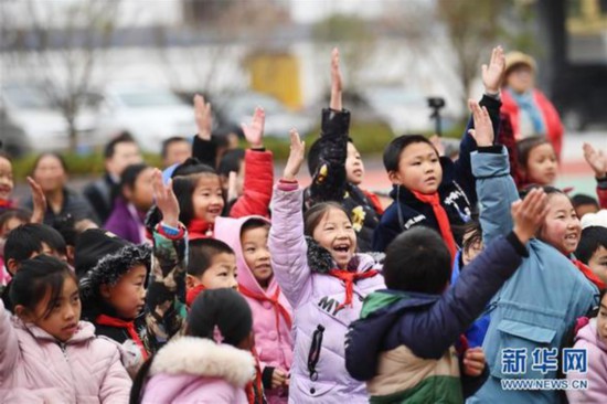 重慶市石柱土家族自治縣中益鄉(xiāng)小學(xué)的同學(xué)們?cè)谖乃囇莩霈F(xiàn)場(chǎng)與演員互動(dòng)。當(dāng)日,“我的中國(guó)夢(mèng)——文化進(jìn)萬(wàn)家”中國(guó)視協(xié)文藝志愿服務(wù)小分隊(duì)走進(jìn)中益鄉(xiāng)小學(xué),為師生們帶來(lái)精彩的文藝表演(2019年12月12日攝)。新華社記者王全超 攝