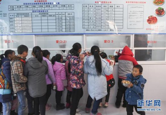 重慶市石柱土家族自治縣中益鄉(xiāng)小學(xué)學(xué)生在食堂排隊(duì)打飯菜(2020年1月10日攝)。 新華社記者 王全超 攝