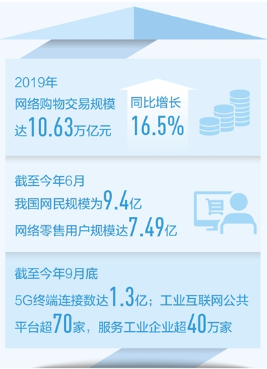 截至2020年6月,我國網(wǎng)民規(guī)模為9.4億,網(wǎng)絡零售用戶規(guī)模達7.49億。2019年網(wǎng)絡購物交易規(guī)模達10.63萬億元,同比增長16.5%。截至今年9月底,5G終端連接數(shù)達到1.3億;制造業(yè)數(shù)字化轉型穩(wěn)步前進,工業(yè)互聯(lián)網(wǎng)公共平臺超過70家,服務的工業(yè)企業(yè)超過40萬家……如今,數(shù)字經(jīng)濟蓬勃發(fā)展,成為經(jīng)濟發(fā)展的新增長點,產(chǎn)業(yè)數(shù)字化與數(shù)字產(chǎn)業(yè)化的基礎更加堅實,不斷為高質(zhì)量發(fā)展注入新動能。
