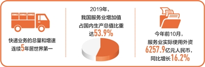 過去兩年,我國宣布了眾多金融業(yè)開放措施,以金融業(yè)為代表的服務業(yè)開放成為我國全面擴大對外開放的“重頭戲”?!笆濉币詠恚覈諛I(yè)對外開放新舉措密集出臺,服務業(yè)開放步履鏗鏘。統(tǒng)計顯示,今年前10月,服務業(yè)實際使用外資6257.9億元,同比增長16.2%。