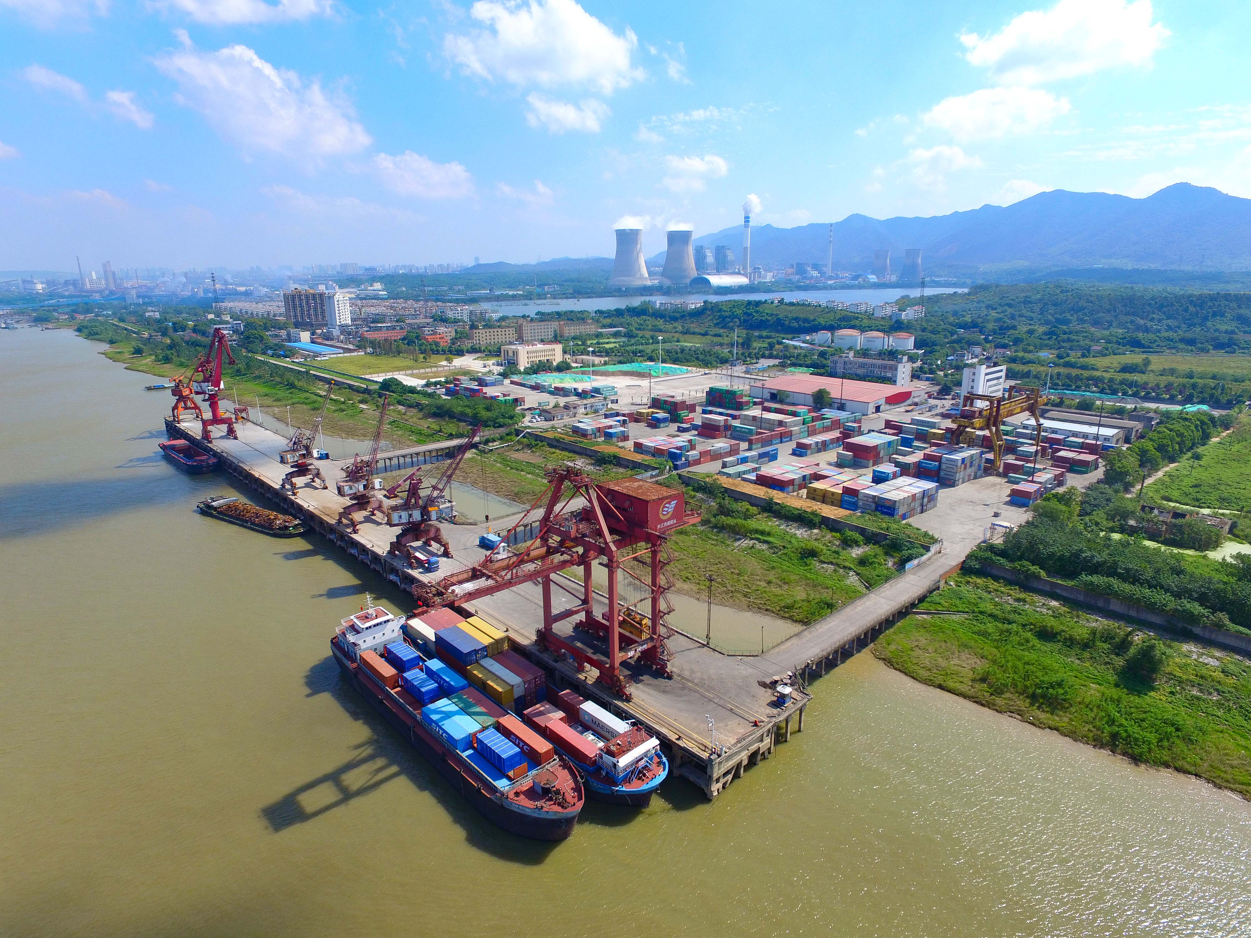 圖3:在安徽銅陵港長江外貿碼頭,港口機械在裝卸集裝箱物資。安徽銅陵是我國重要的銅工業(yè)基地,銅陵港是長江萬噸級輪船終點港。銅陵日報記者 詹俊 攝