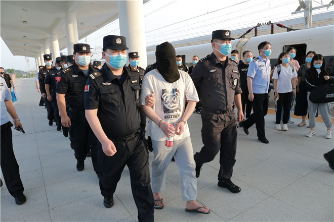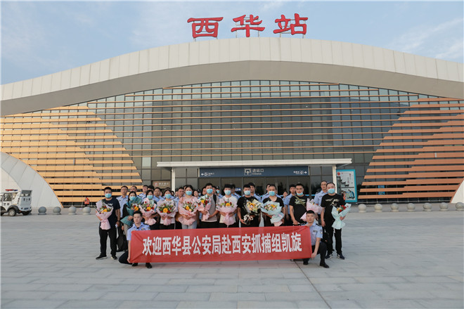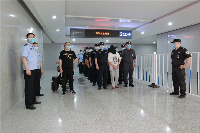 當天,西華縣公安局在鄭阜高鐵西華站舉行歡迎儀式,迎接赴西安抓捕組凱旋歸來。特警在站臺上排列整齊、嚴陣以待,列車準時停靠到站,7名犯罪嫌疑人隨即被押解下車,全副武裝的特警立即上前進行押解交接,押往在高鐵出站口等候的裝甲車上。至此,歷經(jīng)三天三夜,一起電信網(wǎng)絡(luò)詐騙團伙案成功告破。