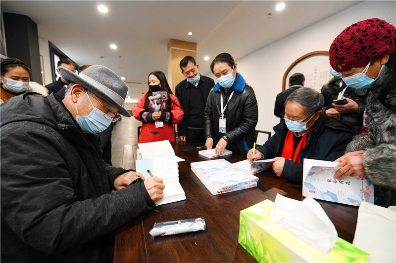返鄉(xiāng)參加開(kāi)館儀式的著名作家劉慶邦、墨白為讀者簽字贈(zèng)書(shū)